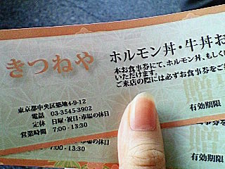モラタメさんでの年末年始特別企画、「ワッショイワッショイ!築地場外市場へレッツラゴー♪」で当選した、きつねやさんのペア食事券(ホルモン丼/牛丼)を食べてきました。