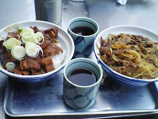 ホルモン丼と牛丼を一つずつ注文しました。お店のおばちゃんが、慣れた手つきで大きな鍋から具をすくい出し、白いご飯の上にドバッとのせる。お茶に割り箸が銀のトレーに乗せられ、いい匂い。
