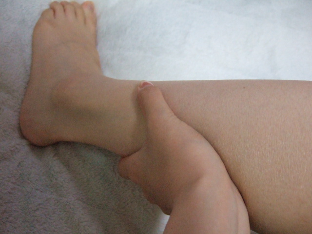 血行が良くなったお風呂上りに、メタボオイルを手のひらに出し、太ももの裏側からふくらはぎに向かって全体に広げていきます。オイルがするするっと肌の上を滑らかに伸びていきます。手のひらを押し当てて熱を逃がさないよう馴染ませたら、憎き