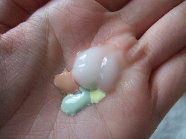 肌に合ったカラーを小豆大、コントロールカラーを米粒大、ゲルクリームを小さじ1杯。私は標準色のナチュラルと、透明感を出すグリーン、保湿力を高めるホワイトを手のひらに出しました。(ちょっとグリーンが多めになっちゃいました